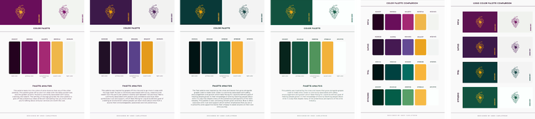 Once I had the logo designs completed, I moved on to establishing a color palette for the brand. I met with my client who wanted a brand palette that used either the colors of wine or typical colors found on a winery. I used that information to create these color palettes.